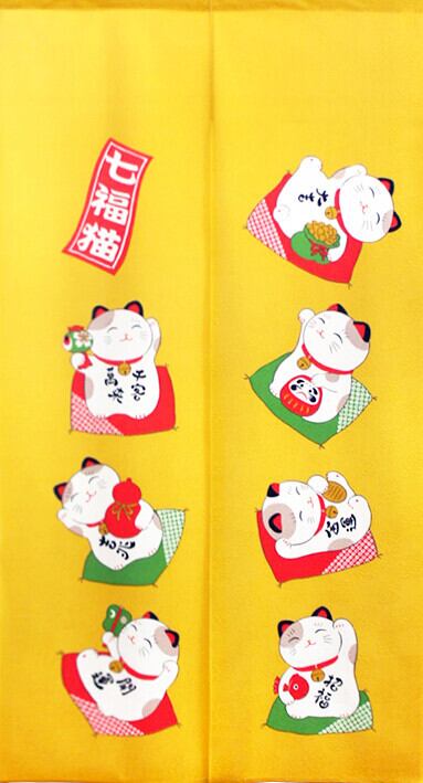 のれん 85X150cm「開運七福ねこ イエロー」【日本製】